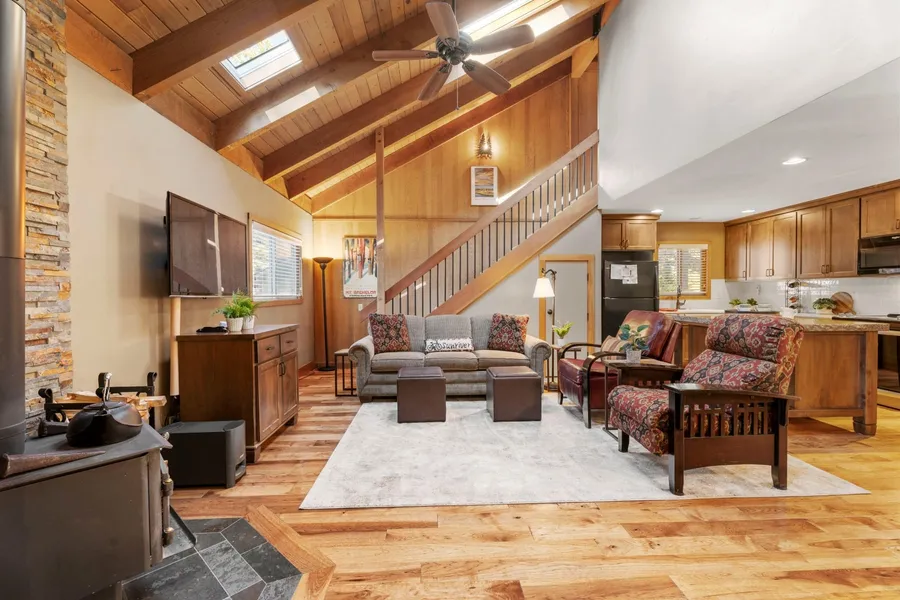 Experience the perfect blend of modern comfort and rustic charm in this beautifully remodeled 3-bedroom, 2-bath Sunriver cabin. The main level, updated in 2024, boasts an open great room design with a fresh rustic aesthetic, highlighted by a cozy woodstove and hardwood floors. The spacious kitchen features a stunning live-edge slab granite island, new appliances, & stylish tile backsplash. Step outside to a covered paver patio and enjoy the fully fenced, landscaped courtyardideal for outdoor gatherings and relaxation. Additional features include a metal roof, new HVAC and heat pump, a convenient storage area, & tasteful furnishings. Conveniently located near The Village, you'll have easy access to grocery store, restaurants, coffee shops, activities, the SHARC aquatic center, & Sunriver Resort. Just park your car & enjoy the close proximity to all Sunriver amenities! With SHARC paid, this cabin is ready for you to embrace the Sunriver lifestyle. Don't miss this exceptional retreat!