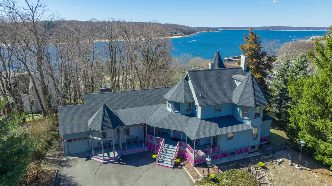 Behold! A rare opportunity to own a piece of history. This stunning 1874 Victorian masterpiece with a turret, nestled on .62 acres, offers breathtaking panoramic views of Northport Harbor. You will enter the house via the wraparound front porch and find yourself in a charming vestibule. Beyond, the house opens up to reveal a multitude of delightful sitting areas in an open concept -- all focused on the spectacular view beyond and enhanced by a wide swath of windows. Admire the intricate beamed ceilings and revel in the architectural details that define this truly special home. Among the 15 rooms, you will appreciate the intimate parlor with its fireplace, a living room, and a formal dining room. Down a few stairs, there's a new kitchen designed to capture an earlier era, that's open to a spacious den, also with tall windows offering panoramic Harbor views. This floor also holds a library or bedroom with a woodburning fireplace and a period en-suite bath, as well as an office or walk-in-closet. On the second floor, there are 3 bedrooms and a full bath, and in the third-floor aerie, you'll find a hide-away that offers the most spectacular views in the house. Yes. There's also a very spacious basement with a finished room, a laundry, and many, many storage options. Outside, there is a deck, spacious lawns with a sprinkler system, and a delightful Victorian garden with a wrought iron gate, multiple wrought iron benches, and a lovely three-tiered fountain. Northport Village, with its beautiful waterfront park and acclaimed theater, also takes pride in its curated shops and renowned restaurants. This is more than just a house; it's a jewel that has been cherished throughout its years. Don't miss your chance to become its new owner.