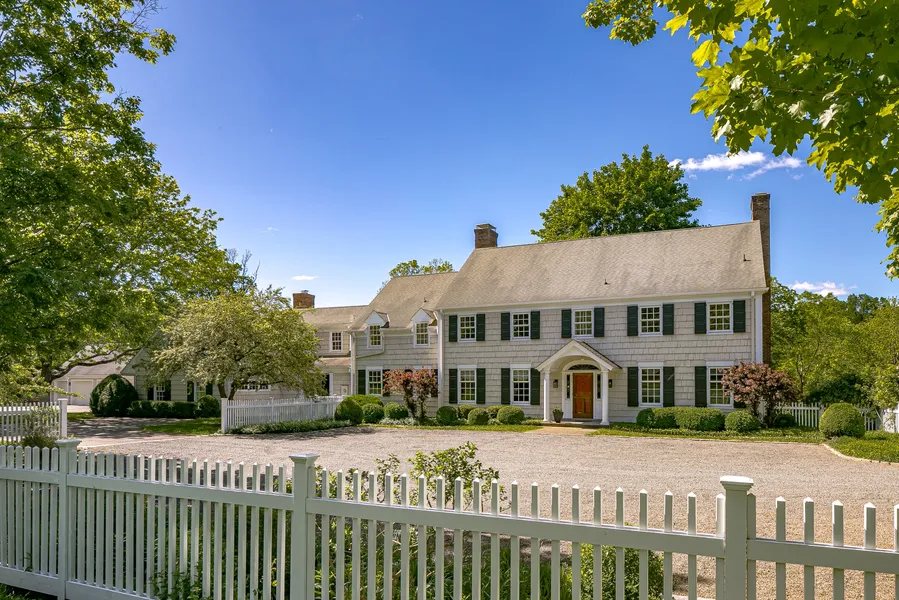 The spacious home exudes charm from the front courtyard, lined with a landscaped white picket fence, to the two back terraces overlooking the pond. Additions to the original Bill Halsey designed house includes a large radiant-heated kitchen with a sitting area that optimizes views of the property and the adjoining family room with a 10-foot tray ceiling and towering wood-paneled fireplace mantel. Complementing these are the elegant formal rooms with charming details like a built-in china cabinet in the dining room and columned pilasters in the living room.