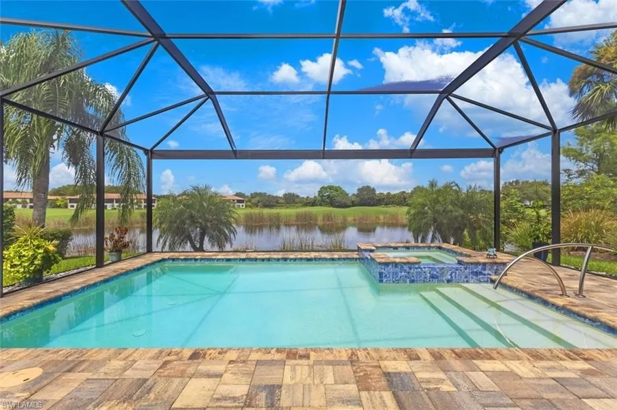 Elegant details such as VAULTED CEILING, double-cushioned PLANK FLOORING, and PLANTATION SHUTTERS add sophistication throughout. For peace of mind, the home is equipped with ELECTRIC HURRICANE SCREENS on the lanai and ACCORDION SHUTTERS on all windows.