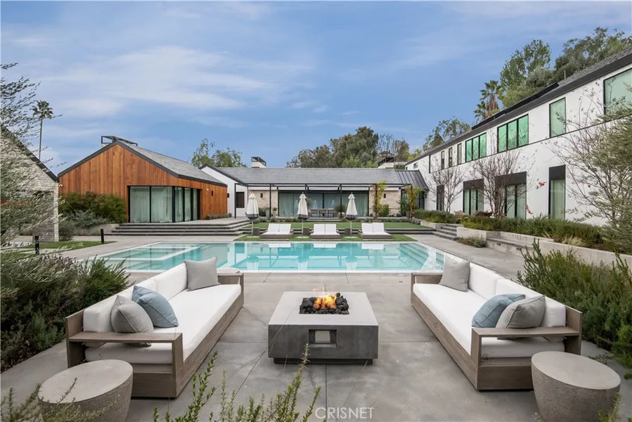Located within the coveted community of Hidden Hills, The Reserve at 5727 Jed Smith Road, is an estate unlike any other. This modern Napa Valley-inspired ranch compound is the pinnacle of California Living. This newer-built estate, which is situated on over an acre of land, features an open great room, gourmet kitchen outfitted with Gaggenau appliances, and automatic glass doors which lead into a lush resort-style backyard complete with zero-edge pool, outdoor cabana with complete kitchen, guest house, and neighbored by conserved land. Luxury amenities include: an elevator, four kitchens, three laundry rooms, gym with an infrared sauna, home theater, laundry jet, refrigerated wine cellar, whole home purified water system, dog run, plaster had-finished walls throughout and a six-car garage with carousel. The approximate 2,000 sq. ft. primary suite incudes a kitchenette, oversized dual shower, marble clad bathroom with heated floors, hidden TV, two fireplaces and a private and peaceful patio. A must see estate!