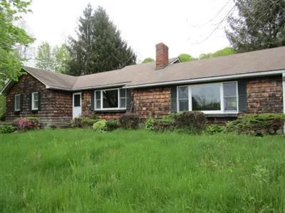 Privacy galore on over seven acres! Charming three bedroom ranch with open floor plan, fireplace in living room and country kitchen with center island. Great views! Sold as-is.