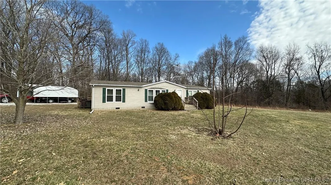 This well-maintained, one-owner home offers 1,512 square feet of thoughtfully designed living space on a peaceful 2+ acre lot. Step inside to discover an inviting open floor plan that seamlessly connects the living spaces. The oversized living room bathes in natural light and features a cozy, vent-free gas fireplace, perfect for those chilly Indiana evenings. The huge kitchen is a home chef's dream with abundant cabinet space, flowing into a formal dining area that opens to a spacious rear deck - ideal for outdoor entertaining or morning coffee. This three-bedroom home features a split bedroom layout for added privacy. The primary bedroom is generously sized and includes an enviable ensuite bathroom with a separate shower and soaking tub. Every bedroom boasts huge walk-in closets, giving you plenty of storage space. Practical amenities include a convenient mud/laundry room, an accessibility ramp, and a carport with a bonus storm shelter underneath. A storage shed provides extra space for your outdoor equipment and tools. Recent updates include a new furnace and a roof that is less than two years old. Located in a private, secluded setting, this home offers the perfect balance of countryside tranquility while maintaining easy access to local amenities. Being sold as-is, this property welcomes inspections and is ready for its next chapter. Experience the joy of country living in this well-designed, comfortable home that truly has it all! Sq ft & rm sz approx.
