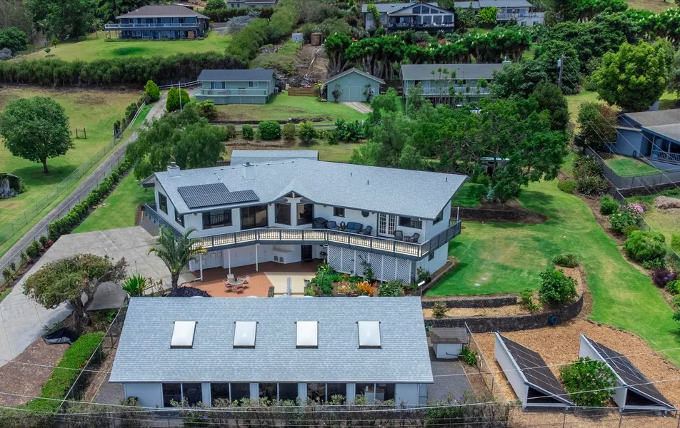 This stunning Kula property is a true gem, offering breathtaking bi-coastal views from its expansive 825 sq. ft. deck. The primary residence, featuring 2,885 sq. ft. of beautifully designed living space, boasts vaulted ceilings, custom cabinetry, and a cozy stone fireplace, creating a warm and inviting atmosphere. The lower level provides an additional 1,270 sq. ft. with its own separate entrance, making it ideal for multiple living arrangements or guest accommodations. The property also includes a charming 585 sq. ft. one-bedroom Ohana, complete with its own private patio and raised garden beds, ensuring both privacy and comfort. Parking is ample, accommodating up to five vehicles, and both the main home and Ohana are equipped with separate electric meters and net metering systems for added convenience and efficiency. Additional features include a two-car garage with a dumbwaiter for easy access to the kitchen, a 448 sq. ft. barn, and a fully enclosed 1,728 sq. ft. pool house, perfect for entertaining year-round. The pool house includes a solar heating system, providing comfort regardless of the season. The property is further enhanced by beautifully landscaped flower beds and a variety of mature fruit trees-such as citrus, bananas, and avocados-as well as herbs like rosemary, mint, and bay. With updated roofs and a new Health Department-approved septic system installed in 2022, this meticulously maintained property offers a serene, park-like setting, defined by four rock walls that elegantly enclose the gently terraced grounds. This unique opportunity to own a piece of paradise in Kula combines luxury, functionality, and natural beauty.