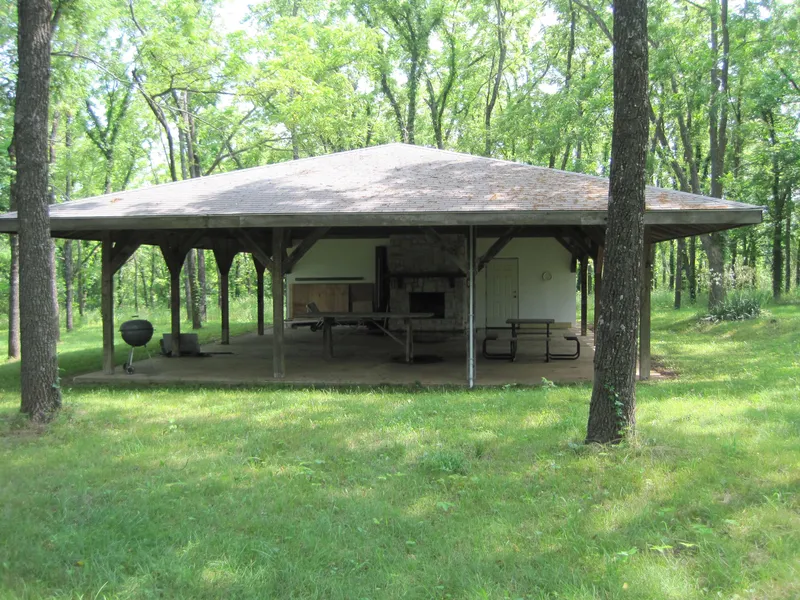 The perfect getaway! 58 Acres of mostly heavy timber, accented by your pavilion retreat. The pavilion is about 1500 square feet (per county) with a huge stone fireplace. There is a garage with a work area attached. Water & electricity on site at the pavilion. Very heavy timber with a wet weather creek. Great for hunting!!