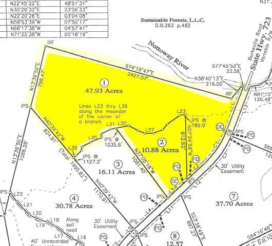 23.59' frontage on the Nottoway River consists of Lot 1 47.93 Acres and Lot 2 10.88 Acres. Branch through land.