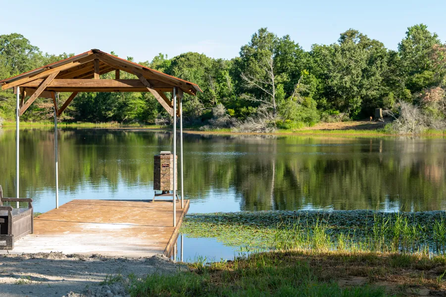 Perched at the top of the hill, as you continue across the improved lake dam and concrete spillway, youll notice the fully furnished 4 bed / 2 bath home with water well and underground power. Strategically positioned, the full-length covered porch overlooking Lake Lucy provides a front row seat and breathtaking views for both sunrise and sunset. Get dialed in -OR- perhaps participate in some friendly competition between family and friends at the fully equipped pistol and rifle ranges with covered shooting benches.