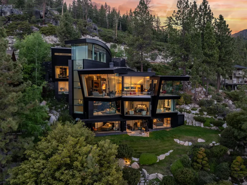 Architecturally significant and masterfully engineered, this nearly 10,000 sq ft residence is one of Lake Tahoe's most striking modern homes. Designed by internationally acclaimed architect Mark Dziewulski, the estate is sculpted of glass and steel and perched above 98 feet of pristine Crystal Bay shoreline. A commercial-grade elevator encased in glass, a five-story floating staircase of layered glass, and floor-to-ceiling windows that tilt the eye toward the lake—every element is a feat of design and innovation.