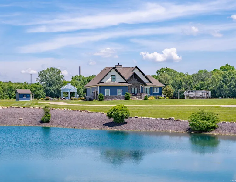 This stunning home featuring 4 bedrooms, 2 full, and 2 half baths, sits on 5 acres on the outskirts of Rockport. As you pull into the driveway, you will see the home overlooking the lake in front. The fantastic front porch invites you into the large foyer and then into the open living room/kitchen. The eat in kitchen has Amish built cabinets, quartz countertops, and stainless steel appliances! The living room has a stone double sided fireplace (also seen from the dining room) and doors that lead to the back porch. The dining room has a window that overlooks the front yard. There is an office just off the living room that is a great space to relax! The main bedroom is very spacious, has 2 walk in closets, and a fantastic en suite bathroom with a tiled walk in shower. Completing the main level is 2 bedrooms with a jack and jill bath and the laundry room. Upstairs is a large room with a walk in closet and full bath. The attached 2 car garage has plenty of additional storage space! Outside is your personal oasis! With a beautiful 20x40 inground pool complete with a diving board and small pool house, you can spend all summer in your backyard! You will also find a pergola, grain bin shelter, and porch with concrete counters and a wine chiller and mini fridge! Just off the side of the home you will find a basketball court with a Goaliath adjustable goal and a light for some night time games! The stocked lake has a small sitting area and a waterfall feature on the side. There is an additional 5 acres with a pole barn that can be purchased as well. This property is something special to see! IMMEDIATE POSSESSION!