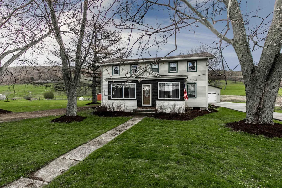 Impeccable condition 1800's farmhouse! Spacious 3 full bedrooms- one is a Primary Suite with relaxing day spa type bath. Completely redone kitchen includes all new appliances and solid surface countertops. Formal dining room leads to a living room and family room, all with beautiful natural woodwork. First floor office could be converted to 4th bedroom. Main floor bath with walk-in shower. Enclosed front porch is a relaxing three season room to enjoy puzzles, chess, or just a quick nap. Outside boasts a large 2 car detached garage with more than enough room for a workshop and storage, fully insulated and with electrical service. Converted horse barn currently used to house a small herd of show cows and goats. Relax in the back yard by the pool and enjoy the patio and fire pit. All this situated on just over 3 deeded acres.