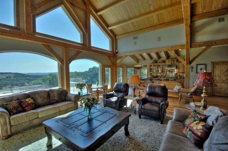 3,600 sqft 1 story 4 bedroom 4 bath custom, well kept and positioned home with standing seam metal roof, custom cabinetry, hand carved wood floors, beams, huge windows with tremendous views, covered back patio/entertaining area overlooking lake #2.