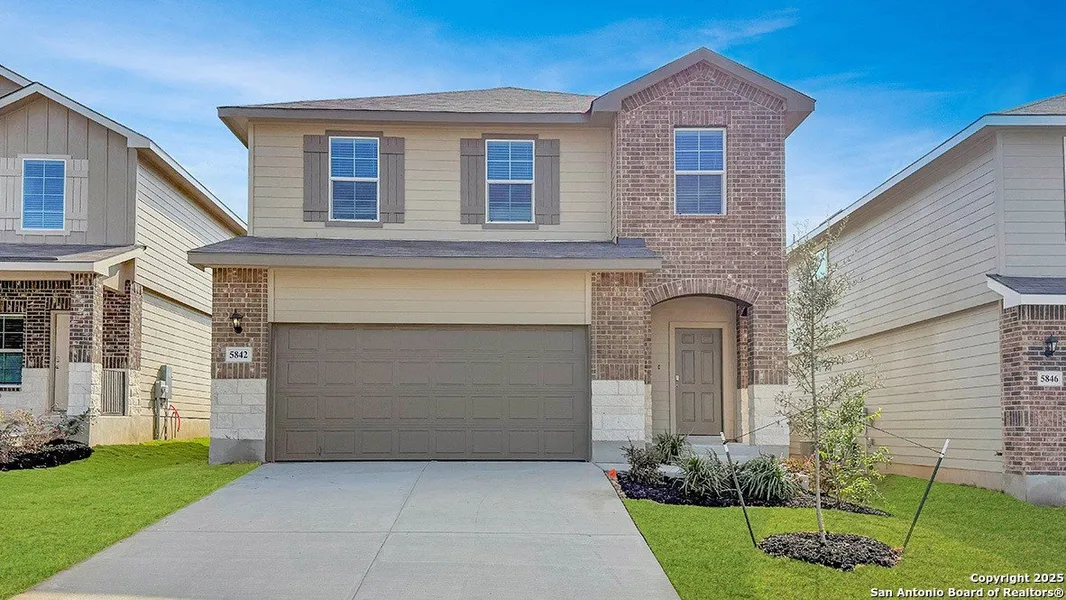 Step into The Grace floor plan at Stonehill in San Antonio, TX. This home showcases 2 classic front exteriors, full yard landscaping and irrigation and a 2-car garage. Inside this 4 bedroom, 2.5 bathroom home, you will find 1952 square feet of living space designed to meet your needs. The arched front patio opens to a grand foyer which then leads to a spacious living room. The living room blends seamlessly into the kitchen and dining area in an open concept floorplan. Your kitchen is built for the ultimate home chef and offers quartz counter tops, stainless steel appliances, and a kitchen island overlooking the living room. Don't forget a deep, single basin kitchen sink for convenience and ease. The staircase leads to the upstairs main bedroom suite, all secondary bedrooms, and your utility room. The Grace floor plan is ideal if you want to keep your entertaining space and private space separate. The upstairs main bedroom has an attached bathroom that includes a tiled walk-in shower, separate water closet and plenty of storage space with built-in shelving and a grand walk-in closet. Additional features of this home include sheet vinyl flooring in the entry, living room, and all wet areas, quartz countertops in all bathrooms and our HOME IS CONNECTED base package. Using one central hub that talks to all the devices in your home, you can control the lights, thermostat and locks, all from your cellular device.