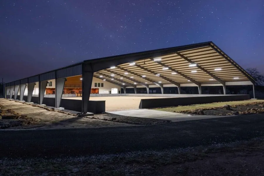 Equestrian Stables/Arena: A state-of-the-art equestrian facility boasts six custom 12x12 stalls, indoor tack-up bays, a wash bay, and a temperature-controlled tack room. Above the stalls is a living suite, a viewing lounge, and an expansive viewing deck overlooking the arena. The covered arena, equipped with Pinnacle footing, 40 Linear LED lights, and a custom audio system, provides a year-round riding experience. Four large turnouts and a stunning outdoor arena complete the equestrian haven.