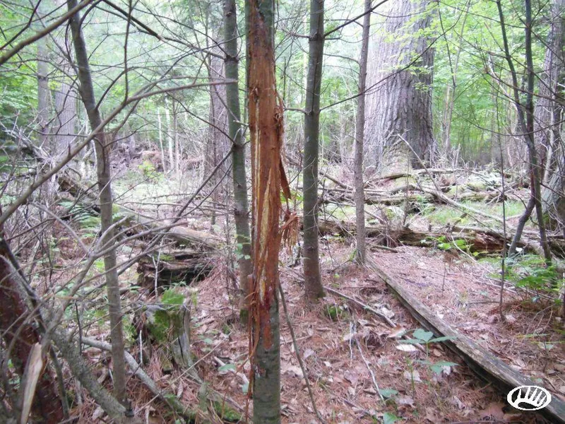 - Heavily traveled deer trails, numerous trees torn up by rubs, including some massive rubs