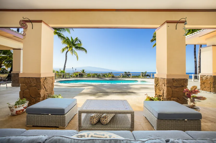 High end quality finishes throughout this upscale resort style luxury residence. You could not rebuild or replace this home anywhere near this price. This is an entertainment home with 4 private bedrooms, 3 full and 2 half baths.The covered lanai (over 1100 sq ft covered) for exterior living. The home is perched high on a knoll with incredible ocean views from Mauna Kea to Maui. Whale watch to your hearts content! The open floor plan has kitchen, dining, living and game area all looking out to the beautiful pool and Pacific blue ocean with sunsets daily.Two sub zero wine coolers holding 112 & 78 bottles. The Crestron Smart Home control system is set up for all audio (speakers in every room and 4 car garage), video and lighting control for the entire home. Every room has different exquisite stone, tile, Italian Marbleized Venetian plaster, wallpaper and finishes for an extremely exciting living experience! Huge Chef's kitchen includes a 6 burner Wolf gas range with griddle, convection microwave, trash compactor Bosch dishwasher and large separate Subzero refrigerator and Freezer. A hidden Butlers pantry off the kitchen with a full size Sub-zero refrigerator, a second Bosch dishwasher and lots of extra storage. Granite counter tops, stone, bamboo, and coconut hardwood floors, Sapele African mahogany wood doors, window trim and cabinets throughout. There is a luxury media room! The master suite has his and her closets also with Sapele wood working along with a stacked full size washer and dryer.The bath has a Jacuzzi tub, and a large shower with Mr. Steam and dual shower heads. There are 2 other large bedrooms with their own ensuite baths. The 4th bedroom is used as an office by the front entry way for in-home business opportunities. Expansive covered lanai. Poolside Kitchen Includes a kegerator, fridge, dishwasher, cook top and ice maker. Big bonus is 10 KW PV owned net metering system and Solar Pool Heater. See video https://my.matterport.com/show/?m=Foy98Tjqfw4