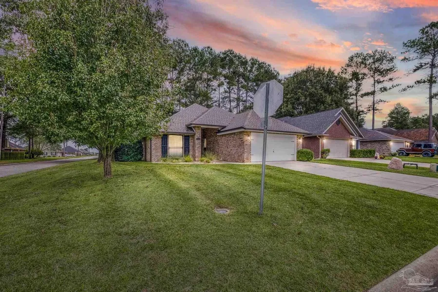 Welcome to this beautifully maintained, established brick home on a desirable corner lot in Pace, Florida-offering timeless construction, modern updates, and everyday comfort. This 3-bedroom, 2-bath home features an open floor plan with a spacious living area that flows effortlessly into a stylish kitchen complete with dark granite countertops, stainless steel appliances, rich wood cabinetry, and a large breakfast bar, perfect for entertaining and daily living. The primary suite serves as a relaxing retreat with tray ceilings, custom lighting, and a generous walk-in closet. The ensuite bathroom boasts granite vanities, a soaking tub, a tiled walk-in shower with glass enclosure, and a private water closet. Two additional bedrooms provide plush carpeting and ample closet space, sharing a well-appointed guest bathroom with granite countertops and a tub/shower combo. Step outside to enjoy Florida living at its best. The covered patio overlooks a fully fenced backyard with mature shade trees, a storage yard building, and a manicured lawn-ideal for pets, play, and outdoor gatherings. The newly installed paver driveway adds curb appeal and complements the home's classic brick exterior. Recent updates include a 1-year-old roof, 3-year-old water heater, and hardwood floors throughout the main living areas, making this home truly move-in ready. Located minutes from top-rated Santa Rosa County schools, shopping, dining, hospitals, and easy interstate access, this Pace home offers the perfect balance of convenience and tranquility-just a short drive to the white-sand Gulf Coast beaches.