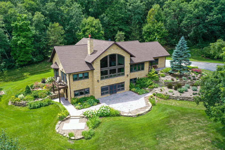 This country estate nestled among majestic trees, glorious flower gardens and a spring-fed pond is a peaceful retreat. There is superior craftsmanship inside and out with stone exterior, wood flrs, sparkling windows, paver patios and two stone fireplaces. High-end modern finishes include new Wolf/Subzero/Cove appliances, quartz counters, custom cherry cabinets and elegant remodeled baths. Fully exposed LL with radiant heat and kitchenette has FP & doors to a patio overlooking beautiful grounds. Fully equipped guest house with a heated 4 car garage offers options for guests, hobbies or office. Groomed trails in the 40 acres of hardwoods lead to spectacular rock outcropping with breathtaking views. This is a perfect place to experience tranquility and the sights and sounds of nature.