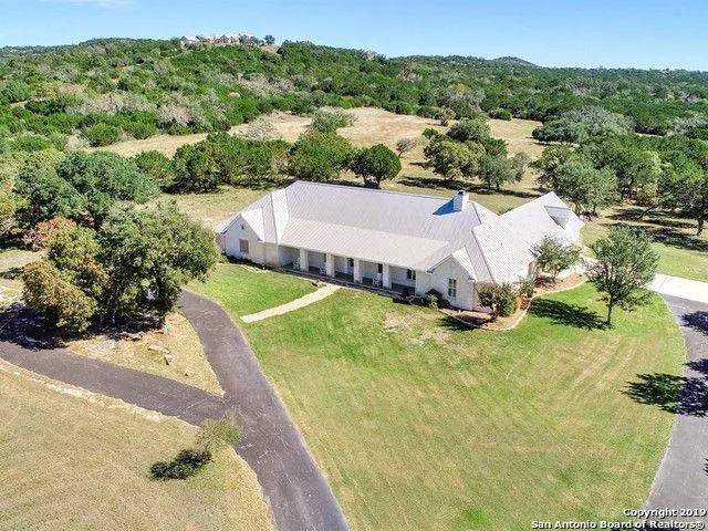 Beautiful 3723 square foot stone open concept one-story home with split floor plan including three bedrooms [Master Suite bath beautiful with two large walk-in closets and his/her sinks], three bathrooms, one half-bath. Bedrooms have walk-in closets. Plenty of storage closets throughout home. Plantation shutters throughout. Beautiful living room, rock fireplace, built-in cabinets, surround sound. There is also a detached 560 square foot Guest quarters above garage includes one bedroom and one bath. NOTE: Square footage figures as per Kerr Central Appraisal District and not confirmed by owner or Realtor. Two-owner custom built in 2002; room measurements available upon request. Covered front porch 7 x 55 [tiled floor] with the beautiful views of the distant Hill Country. Back covered patio 15 x 24 and 11 x 55 [tiled flooring]. 16 x 16 open concrete patio [off Master Suite] ready for a hot tub with water and 220 volt.