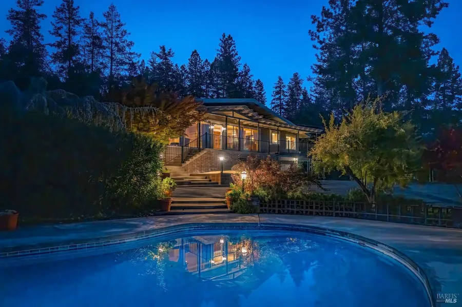 Welcome to 595 Sunset Drive, with layered valley views perched on a knoll, sits this four-bedroom and four-bathroom 3,194 square foot home on 2.39 acres. With vistas for miles, delight in inspirational sunrises and golden sunsets over the valley. Enjoy the sparkling pool while you take in the aroma of Ponderosa pine trees in your own sanctuary. Nature abounds, yet only minutes from downtown St Helena off Howell Mountain Road. Upon entering the home, you will notice floor to ceiling windows to take in the spectacular views. This home lives like a single level, with additional space on the first level. There is also a barn which could be utilized for RV, boat or a gathering place under twinkling lights. Mature landscaping, and ornamental plantings, a fruit orchard, as well as several flat areas, imagine the possibilities. A great producing well (report on file). Leased solar with battery back-ups offering very attractive rates. Fire insurance quote on file in the disclosures. This is the opportunity of a lifetime to live in peaceful harmony with nature yet only minutes from downtown St Helena.