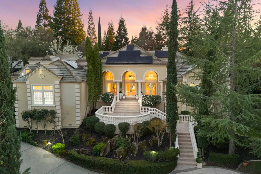 Nestled within the prestigious Los Lagos Estates, this European-inspired manor is a masterpiece of timeless elegance and natural beauty. Set on lush, park-like grounds with majestic oaks, redwoods, and moss-draped boulders, the estate welcomes you with a grand balustrade staircase, an arched portico, and three sets of French doors that open to an exquisite formal entertaining room. Inside, impeccable millwork, soaring 20-foot ceilings, & rich hardwood flooring create an atmosphere of refined sophistication. The primary suite is a serene retreat, featuring a fireplace-lit sitting area, a wet bar, and dual closets, all set against the backdrop of polished stone flooring. A stately office with a coffered ceiling and fireplace offers a distinguished workspace, while a dedicated theater room also an ensuite bedroom provides effortless entertainment. The chef's kitchen offers marble countertops, a built-in refrigerator, a Wolf gas cooktop, & a generous dining bar. A private guest suite upstairs, complete with a full bath, kitchenette, & living room ensures comfort for visitors. The outdoor living spaces are equally captivating, with a pool & spa set against dramatic boulders & cascading waterfalls, evoking a resort-like ambiance. Ample guest parking & 4 car garage.