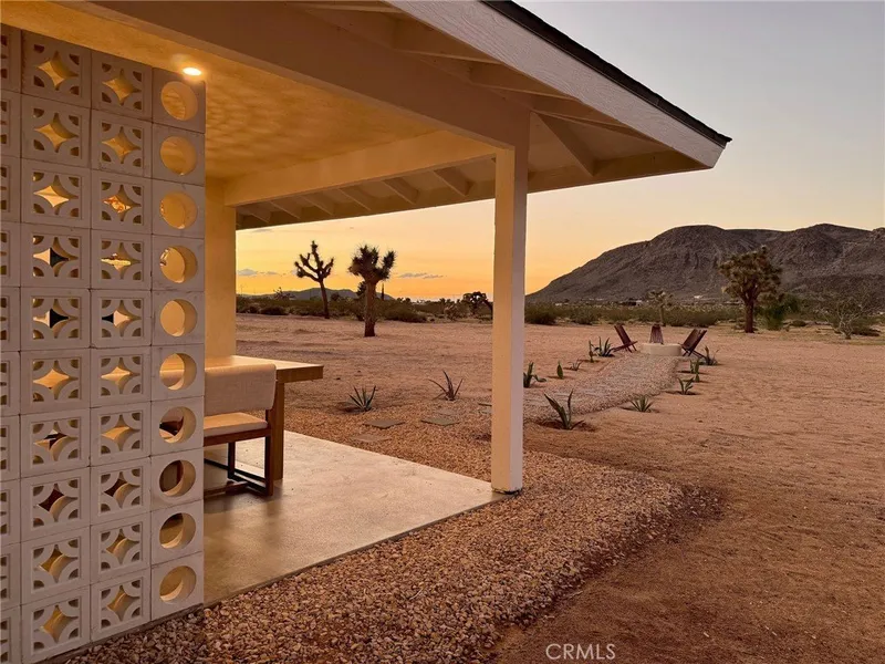Welcome to 59676 Mitch Rd, where Bohemian Flair meets Desert Elegance. This gorgeous turn-key property has been completely remodeled with every feature intentionally chosen to bring you the perfect airbnb, desert home or weekend retreat. This house showcases 3 bedrooms, 2 bathrooms and 5 ACRES OF LAND with stunning panoramic desert & mountain views. Inside you'll find sleek concrete floors, tasteful decor & furnishings, rounded archways, recessed lighting and large windows that let in an abundance of natural light. The warm and welcoming living room flows effortlessly into the awe-inspiring kitchen and dining area complete with designer-style tile backsplash, bright quartz countertops, beautiful modern cabinetry, high-end FORNO appliances and bar seating. Each bedroom is well appointed with mini-splits for year-round comfortability, closets with custom built-in shelving and 2 of the 3 bedrooms adorn french doors that lead to their own private outdoor patios. Both bathrooms boast spa-like showers with sophisticated tile, glass panels and lovely new vanities with clean, modern finishes. The finished garage has been transformed into the ultimate hangout space equipped with a bar, wine fridge, sink, additional cabinetry, a mini-split and a cozy elevated lounge area (there is even a stacked washer/dryer for added functionality). It doesn't stop there; the serene outdoor living space includes a lovely covered patio for outdoor dining, an outdoor shower with a rainfall shower-head, ample space to entertain or relax around a firepit on a starlit summer night. Not to mention, there is more than enough room to build/expand and/or store all your desert toys! This exquisite property is located close to numerous desert attractions like Lander's famous Goat Mountain hiking trails, Giant Rock, La Copine, The Integratron, and only 15 mins from downtown Joshua Tree but still far enough away to fully immerse yourself in all the peace & tranquility this desert home has to offer. Come take a look & let the desert's allure do the rest. Your new desert home or weekend retreat awaits.