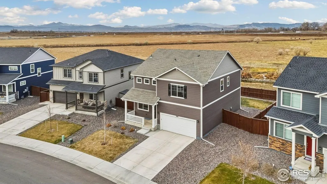 This recently built two-story home sits on a premium lot that backs to open space, giving you sweeping, uninterrupted views of the entire Colorado mountain range and the peaceful feel of nature just beyond your fence line. Inside, the open-concept main living area is designed for easy everyday flow, with durable LVP flooring that ties everything together in a clean, modern look. Light pours in from large windows, making the space feel bright and spacious while offering plenty of room to gather, unwind, or entertain. A custom mural created by local artist Erin Joy Art adds a vibrant splash of personality to the space. The kitchen checks every box with stainless steel appliances, granite countertops, upgraded soft-close cabinets, a center island for extra prep space or casual dining, and a pantry that keeps everything organized. An office area at the front of the home offers a quiet and convenient space ideal for remote work or creative pursuits. Head upstairs to your own private retreat with room for everyone to spread out. A spacious loft creates the perfect family retreat, paired with four versatile bedrooms ready to adapt to work, rest, or hobbies. The primary suite stands out with a newly added window for improved noise reduction, an ensuite bathroom, and a walk-in closet. Outside the backyard is ready to enjoy, with complete landscaping and fencing already in place. Right behind the property, you'll find an open space with horses and wildlife, while scenic nature paths nearby allow you to appreciate natural beauty surrounding the neighborhood. Centrally located for seamless convenience, with quick highway access that keeps you connected to everything you need. Additional updates include a new whole-house steam humidifier for year-round comfort, plus a transferable 10-year new-construction limited home warranty brings an extra layer of confidence to your investment.