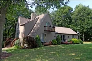 Unique cedar-sided A-frame on 6(private) acres! Long, curving drive takes you back to serene setting atop hill w/farmland views & private woods. Cathedral ceiling, double-sided wood fireplace, decks & balconies, finished walk-out basement, large dining room & den. Oversized 2 car garage.
