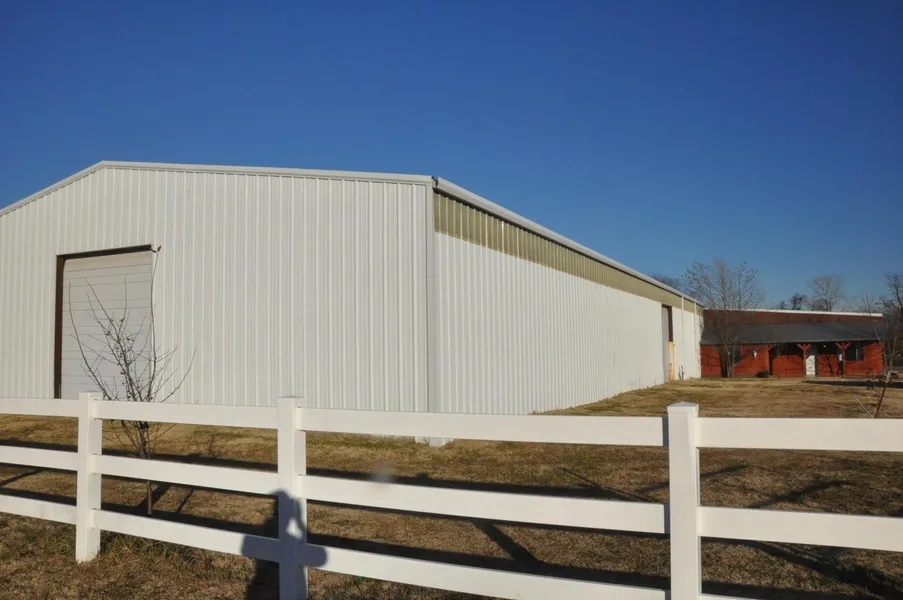 Property features include paved road access,vinyl fencing, pond, storm cellar and overhead doors on each end of the arena.