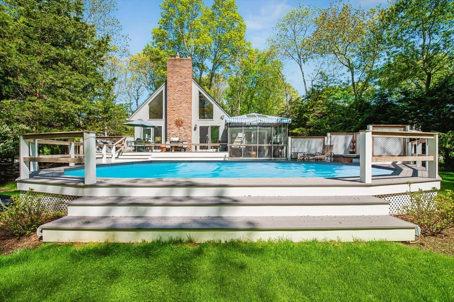 Located in a serene and private waterside enclave, this 3-bedroom, 3-bathroom beach house offers the ideal blend of relaxed elegance and thoughtful design. Set on .38 acres of beautifully landscaped grounds, the 1,472 sq ft home welcomes you with a light-filled living room featuring double-height ceilings, a wood-burning fireplace, and a dramatic wall of glass with sliders that open to an expansive deck and pool area-perfect for seamless indoor-outdoor living. The fully equipped kitchen makes entertaining easy, while two comfortable guest rooms and a full bath on the main level provide privacy and convenience. Upstairs, the spacious primary suite features an en-suite bath and treehouse-like views. A sunken den just off the living room adds cozy, flexible space, with access to a covered porch overlooking the pool and grounds. The lower level includes an additional den and bathroom. Enjoy summer days around the pool or stroll down to your private deeded access to a beautiful stretch of beach on Gardiners Bay. This is more than a home-it's a coastal retreat, offering refined living in one of the East End's most desirable waterside communities.