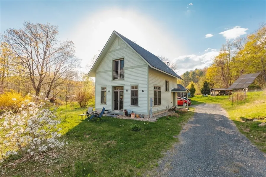 Built in 2014, this light-filled contemporary home offers sweeping views of the Catamount Mountains and is part of the unique Stowe Farm Co- Housing Community. Designed with sustainability in mind, it features owned solar panels, high ceilings, transom windows, and radiant heat in polished concrete floors. A cathedral ceiling on the second floor enhances the airy, open feel. The detached, fully insulated guest cabin is ideal for an office, studio, or visitors. Enjoy a 1-acre lot plus 1/10 ownership of 80 shared acres of forest, trails, and meadows. Gardeners will appreciate the organic plot perfect for growing vegetables, flowers, or fruit trees. Community amenities include shared gardens, a greenhouse, chickens, power tools, a tractor, and a community truck. A rare chance to live sustainably with modern comfort, strong community, and access to the outdoors.