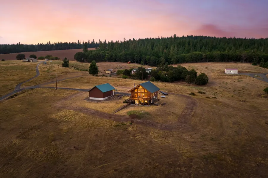 Country side log home on 9.95 acres with Starlink internet service, stunning views of Mt. Hood, open space and incredible neighbors! This property offers modern connectivity in a peaceful serene and restorative setting. The home has been thoughtfully placed to capture stunning views of Mt. Hood while offering rural living. Enjoy high grade building materials with quality finishes throughout. The cozy layout offers space for privacy and reflection while also providing a large open living and dining room with mesmerizing views. Noteworthy amenities include two state of the art Jotul stoves and a 10,000 watt push button back up generator.