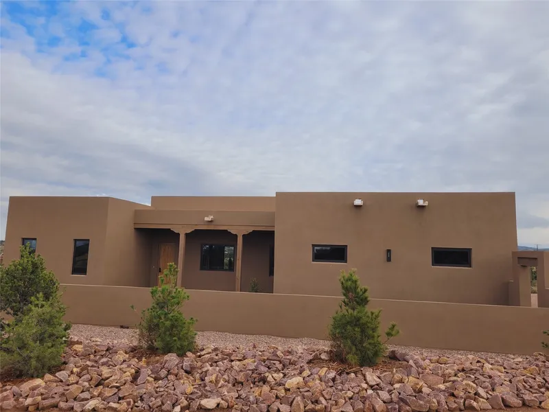 What an incredible place! The views are outstanding! Here you have 6.19+/- acres on a hilltop with views that reach far to the north and far to the west. At this property you can have an art studio or a business right at your home. There is plumbing and septic, and electric all set up to build another building on this lot. You can build an additional casita or guest house! This home is complete and ready to move into. It has the landscaping done with irrigation. The windows were placed to maximize light as well as mountain views. This modern home has gorgeous elements that also tie in the traditional styles of Santa Fe. There are viga beams in the main open concept living/dining/kitchen area. Both the front and back porches have Fir posts and beams with plenty of space to entertain or just relax and take in the beauty of this place. Watch the weather with a cup of coffee or tea on the back porch. There is a Douglas Fir custom-built modern vanity in the guest bathroom as well. The floors are a gorgeous, real wood engineered white oak. The doors are all a beautiful alder wood. Here you have a certified Green design home with Energy Star appliances, a HERS rating certification, and a very well-insulated house with highly insulated windows. This home comes with A/C and forced air heating, which is great when you want the temperature to adjust right away. Every detail was thought out and selected with a discriminating eye. You must come check this beautiful home out to feel what it will be like to live here.