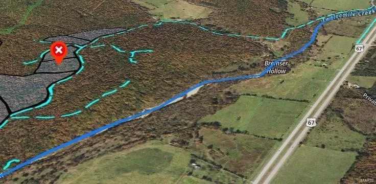 Less than a mile from Mark Twain National Forest, and for a $200 annual fee you get road maintenance and access to a shared 3-acre gravel bar and section of 12 Mile Creek. Did I mention there are no restrictions!!