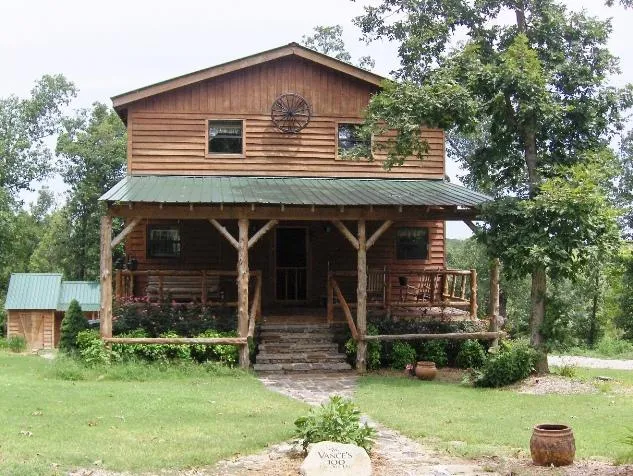 No. 01268 LIVING LARGE IN A COUNTRY WAY Want all the country feel with an upscale glam? Look no further you have found it. This gorgeous wood sided home has a spacious 2410 square feet that exudes charm and appeal. There are three levels, each with personality and country charm. The main level houses the kitchen, dinning, living room, bath, and a back deck for an extended entertaining area and just relaxing. An open floor plan has warmth and style and the cozy fireplace will be a favorite all winter long. Step back in time with a long soak in the claw foot tub or go down to the enclosed wet room and enjoy the view while soaking in the 6 to 8 person hot tub. The upstairs has a loft style bedroom with its own full bath and walk in closet. Lie in bed at night and enjoy the star show in the night sky from the strategically placed windows. Stroll along the catwalk to an outdoor balcony with a calming view of the Ozark countryside. Downstairs are two additional bedrooms with separate kitchenette, full bath and den. There are many extras in this home including, 3 zone heating and cooling, a gas fireplace, generator back up, trash compactor, dishwasher, range, refrigerator, microhood,100 year old cypress trim, beverage center, custom kitchen cabinets and counter tops, lighted stair treads, and much, much more. Outside the home there is a carport at the back for vehicles and a storage building constructed to match the home. At the front of the property you have your own small park, landscaped with native stone and shrubs and a rustic style gazebo with a park style grill. A drainage system is in place for heavy rain so maintenance is never an issue for the driveway. Landscaping is easy care with a sprinkler system in place for plants and shrubs. This one of a kind home can be your place in the mountains $235,000