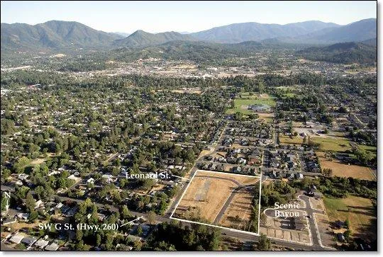 The property had been tentatively approved for 77 individual lots to accommodate 94 residential units. The development plan was not finalized, and all permits expired in June 2008. The property is partially improved with asphalt paving, concrete curbs, some sidewalks and underground utilities. A new owner will need to submit plans to the city of Grants Pass for development. Options could include a redesign for single-family or multiple-family, based on zoning. There is a tentative approval still pending for 31 single family lots. (See Supplemental Information Package for Grants Pass zoning, Planning Commission documents, and other pertinent documents.) The 6.52± acre development site has 468± feet of frontage along the south side of G Street (Rogue River Highway) and 639± feet along the west side of Leonard Street.