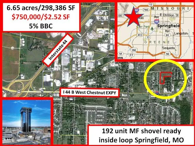 GLOBAL Partners & CBC Vanguard UNTOUCHABLE SPRINGFIELD MO deal. Lowest cost 192 unit MF site shovel ready inside Loop off Chestnut. Superior proximity, low competition, great demographics, outstanding schools, enhanced enterprise zone. $750K/$2.52 SF 5% BBC