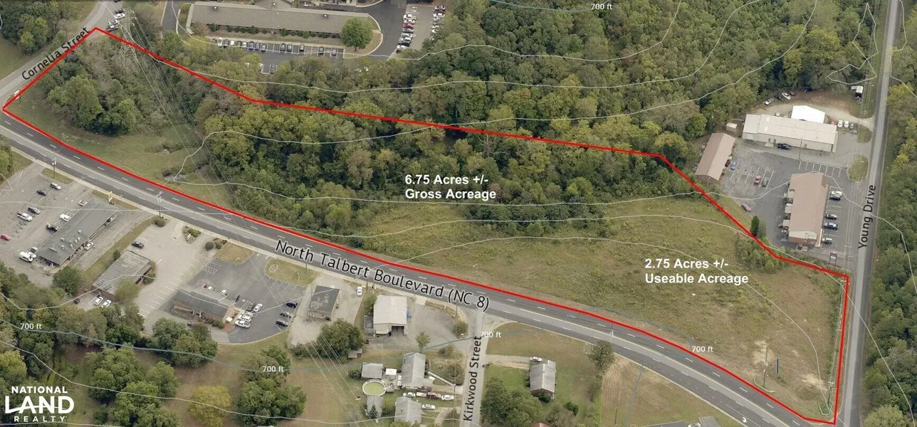 The property is approximately 6.75 gross acres with approximately 2.75 acres useable due to a power line easement, public sewer easement and non-buildable flood zone. The buildable area is concentrated at the corner of North Talbert Boulevard and Young Drive allowing for two points of access. A preliminary site plan has been created anticipating the construction of four buildings ranging in size form 2,400sf to 6,900sf. Public water and sewer is available at the site as are other desired utilities. Additionally, the property is located in an Opportunity Zone.