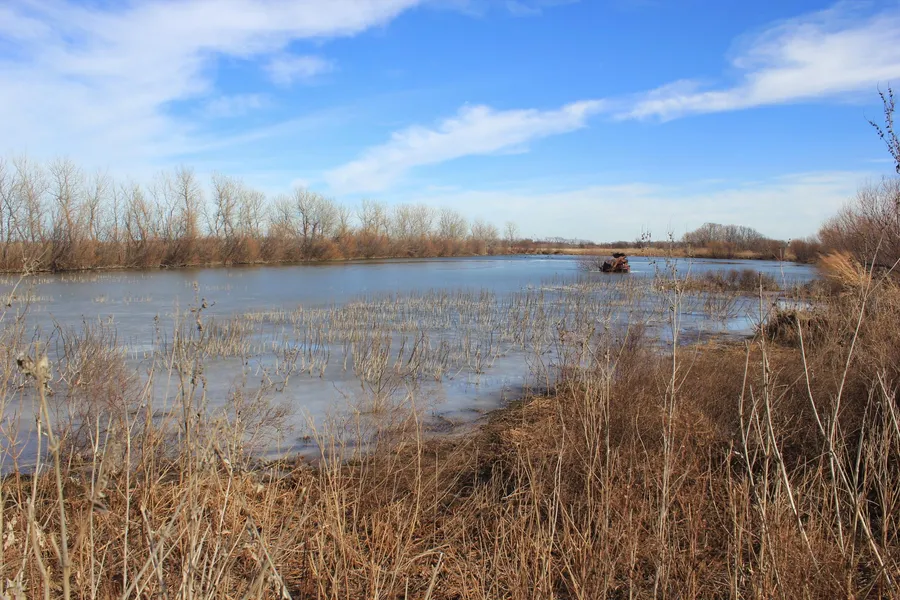 The property has no fences and consists of basically two fields totaling approximately 55 acres. The current owner has been using the land to grow hay for his cattle operation. The fields are divided by a large water slough, which will hold 2.7 surface acres of water when full. This basin is shallow and will go dry. It attracts lots of ducks in the wintertime, when full. I jumped a covey of bobwhites while walking the land. There are deer and hog tracks going through it as well. The whole place is very open, though, and its primary use is for agriculture production.