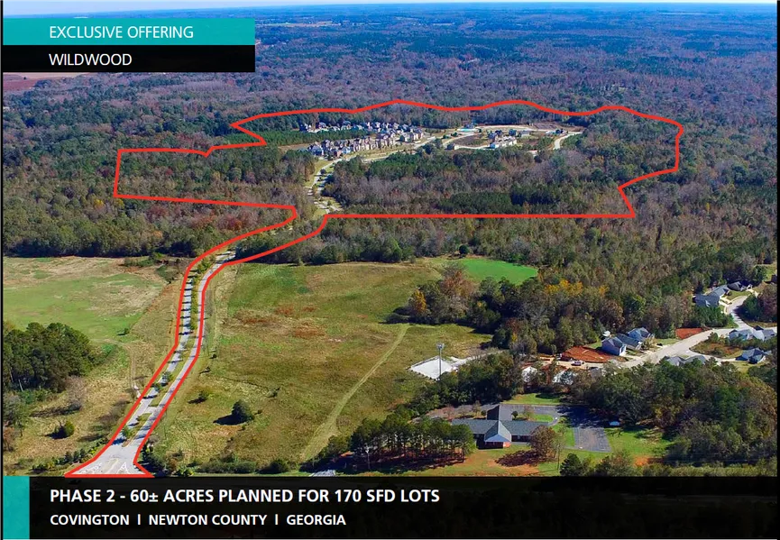 Wildwood - Phase 2 is 60+ acres planned for 170 single family detached lots in Covington, Newton County. The Wildwood subdivision is already established and is served by a clubhouse, pool, tennis courts, lake, and extensive landscaping along the boulevard entrance.