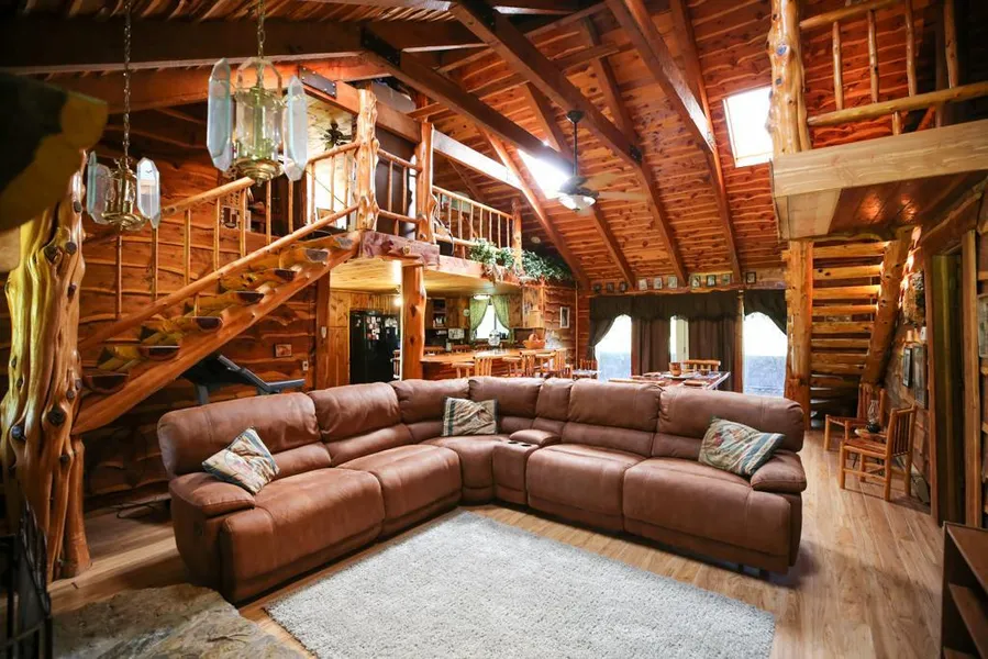 This secluded 60 +/- acre hideaway begins as you turn off of a blacktop road and wind your way into privacy after every turn. At the end of the private drive sits a custom built log home that boasts 5 bedrooms and 3 bathrooms that sprawl over 3 stories and 3,000 square foot. The wrap-around porch is the first thing that catches your eye you as you approach the home. As you enter the cabin, you are greeted with the kitchen that leads into a very large dining area and living room that gives the house a very open and cozy feeling. Red cedar takes main stage as most walls, cabinets, chairs, tables, and ceilings are made from trees that were cut and milled on the property, as the cabin was envisioned. A large, open beamed, vaulted ceiling, and stone fireplace displays the main area of the house in a very grand manner. The master bedroom, master bath, and two other bedrooms are on the main floor of the home, while a separate living area and two more bedrooms with a Jack and Jill bath round out the second floor. As a bonus, there is a loft above the second floor that can be utilized in a lot of ways. If the wrap around porch wasn't enough shade, there is a large screened-in porch on the second level, which can be accessed from the first floor deck and/or a second floor bedroom. The elevated view looks south, down into Bear Den Hollow. The large yard is spotted with mature walnut trees that give afternoon shade. As you go beyond the yard, you will find deep mature timber, a creek bottom with live water, and an open field with a deer blind, and lots of nooks and crannies to explore in the ozark terrain that hold a lot of deer and turkeys. There is an old trail system that will help you access the farm and touches Corps of Engineer ground connected to Table Rock Lake, that gives you lake access. Part of this farm does have fencing throughout, as it held horses at one time. This stellar ozark property combined with the log cabin give you privacy and enough acreage to shut out the world and call this a slice of heaven. More acreage is available if needed. Call Clayton Campbell at (620) 687-2789 for a private tour of this incredible property! Shown by appointment only.