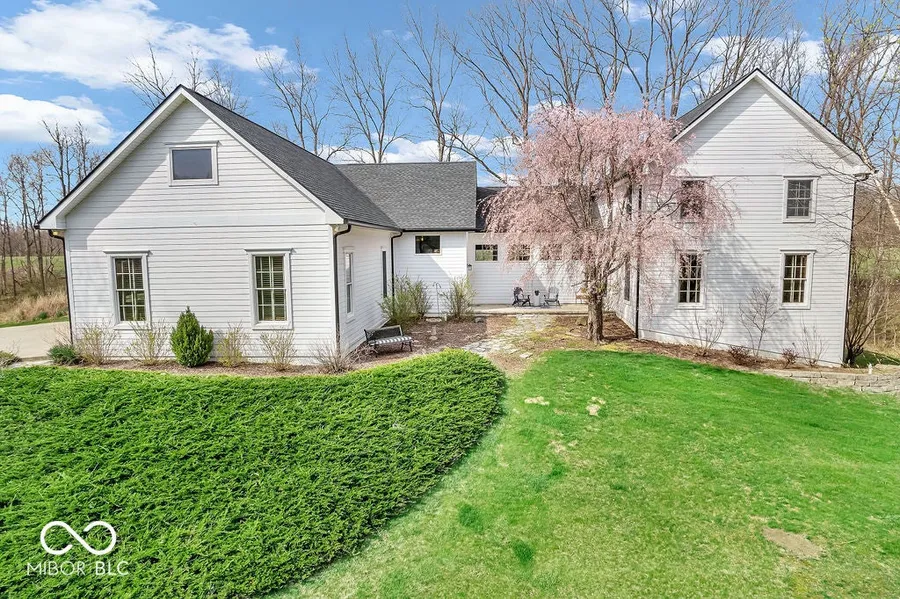 Discover this extraordinary contemporary interpretation of New England Saltbox architecture, situated on nearly four serene, wooded acres in the highly sought-after Oak Ridge Estates. This move-in ready residence has been thoughtfully renovated to the highest standards, blending classic design with modern luxury. The expansive open-concept main level showcases soaring vaulted ceilings, a striking double-sided limestone gas fireplace, custom built-in bookcases, and new hickory hardwood floors. Sunlight pours in through oversized picture windows, bringing the beauty of the surrounding landscape indoors. The gourmet eat-in kitchen is a chef's dream, featuring granite countertops, timeless shaker-style cabinetry, a built-in buffet, and a generous butler's pantry-perfect for entertaining. Retreat to the luxurious primary suite with a newly redesigned spa-style bath, complete with double vanities, a walk-in shower, and a spacious walk-in closet. Upstairs, two additional bedrooms share a Jack-and-Jill bath. The finished walk-out lower level offers exceptional versatility, including a family room with wet bar, full bath, office or guest bedroom, breakfast room, and abundant storage space. Enjoy peaceful mornings and tranquil evenings on the screened porch or open-air deck, overlooking a stunning private woodland complete with scenic walking trails, a gentle creek, fire pit, and frequent wildlife sightings. Relax in the hot tub under the stars on the private open patio. Additional features include a 3-car attached garage and impeccable attention to detail throughout. A rare opportunity to own a secluded sanctuary just minutes from Greencastle's historic downtown and DePauw University.