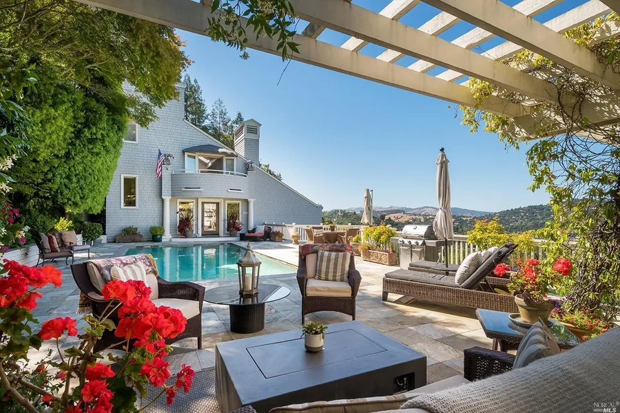 Ross School Dist. in Kentfield, Classic California living with 5 unique outdoor living spaces.Views of mountains, woodlands, and San Pablo Bay. A slate deck surrounds the pool and extends out to a semi-circular sun deck. Versatile 4000sf layout has 3 fireplaces 3 bedrooms and 4 full bathrooms, including 2 primary suites with walk-in closets. Large private detached office. The kitchen adjoins the family room flowing into the dining and living rooms. The sauna, wine cellar, and cabana complete a perfect home for family and entertaining.Six parking spaces including the garage.
