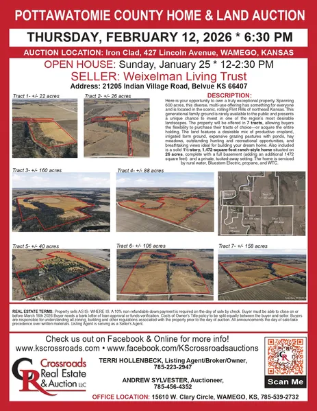 Here is your opportunity to own a truly exceptional property. Spanning 600 acres, this diverse, multi-use offering has something for everyone and is located in the scenic, rolling Flint Hills of northeast Kansas. This generational family ground is rarely available to the public and presents a unique chance to invest in one of the region’s most desirable landscapes. The property will be offered in 7 tracts, allowing buyers the flexibility to purchase their tracts of choice—or acquire the entire holding. The land features a desirable mix of productive cropland, irrigated farm ground, expansive grazing pastures with ponds, hay meadows, outstanding hunting and recreational opportunities, and breathtaking views ideal for building your dream home. Also included is a solid 11/2-story, 1,472-square-foot ranch- style home situated on 26 acres, complete with a full basement (adding an additional 1472 square feet) and a private, tucked away setting. The home is serviced by rural water, Bluestem Electric, propane, and WTC.