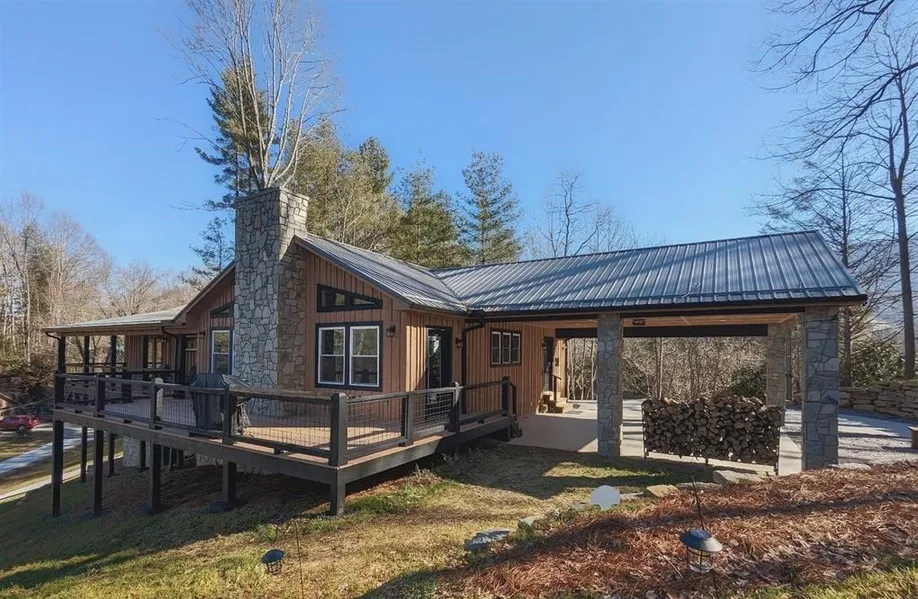 Pinewood Lodge a Beautiful Custom built home (2022) with long range views minutes from Waynesville. This stunning property is a Vacation Rental with a proven track record. Open Ranch plan, 3 BR/2.5 Baths, 2 Car Carport, Lots of windows and natural light, simplicity in one level living. Gourmet KT open to massive Great Room. Great room w/ custom stone hearth and fireplace w/ gas logs leading to wrap around deck perfect for entertaining. Powder room off GR. Open kitchen with vaulted ceilings, custom cabinetry, large stainless sink, cast concrete countertops, stone backsplash, high end stainless steel appliances, kitchen island with bar seating, and a 4.8x10 pantry. Durable vinyl plank flooring throughout. Owners suite w/ gas fireplace, vaulted ceiling, walk-in shower w/custom stonework and bench seat, Double vanities, cast concrete countertops, walk-in closet and private door to covered porch. Guest bath with clawfoot tub custom sink stonework. Firepit area. Furniture negotiable.