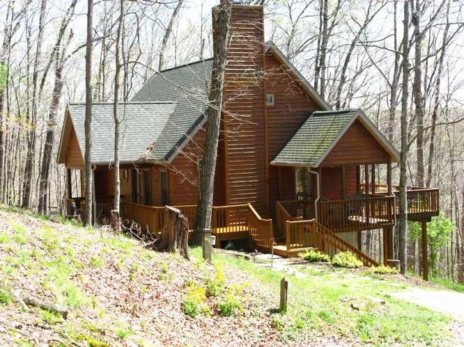 Rustic home has the feel of log--pine paneled walls and cathedral ceiling in great room along with a wood burning fireplace. Dining area takes full advantage of winter view across the hills. Kitchen has center island breakfast bar. Laundry room includes half bath. Big mba with whirlpool tub & separate shower. Great screened porch off mbr. Actually, there's a porch or deck on all 4 sides of the house so plenty of spots to enjoy the outdoors. Wooded 5 acres between Nashville & Bloomington.