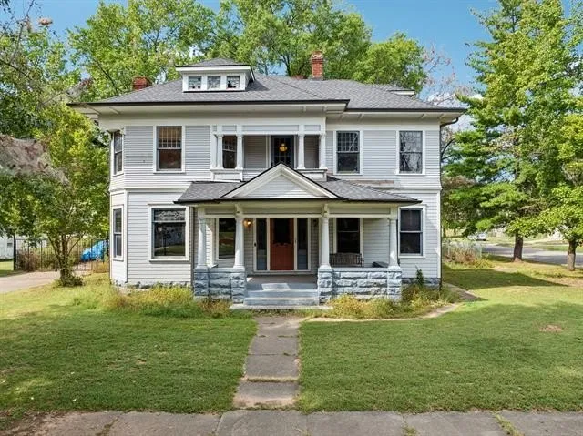 Corner Lot, 4 BR (all upstairs) 2 Bath, 2 Story Home, Custom blinds w/ fabric shades. Pocket doors, original light fixtures, etched glass windows. Roof and guttering was done in 2022. Pex pluming has been put into the kitchen, bathroom, and Carriage home. Piers have been placed in 2022 Study off the Master. A balcony for relaxing, a basement for storage. Beautiful driveway with pavers. Not Move In Ready! Carriage home/Garage as a bonus! 203k or cash only! Don't Miss This Fixer Upper! Selling AS-IS.