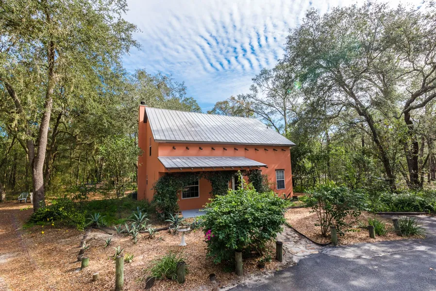 Craving a quiet spot to call home? A piece of land large enough to stretch your arms or throw a frisbee to your dog? Something colorful with personality instead of beige and cookie-cutter? Well! This may be just the place. Elkton offers the best of peaceful country living only 15-minutes outside of downtown St Augustine so you can make a joyful noise and then go home and watch the stars sparkle against the night sky. Come up the long drive flanked by trees and slowly the house comes into view. But first you'll pass a playhouse or shed and then a 1-car garage plus carport appear as you circle around the driveway to the house. Soon the two bougainvilleas will begin to bloom along the flagstone path to the front porch - a burst of tropical color to greet you every day. Once inside you'll find the 2nd bedroom and the hall bath straddling the center hallway. Another few feet ahead and the great room opens up with lofty ceiling two stories high and large windows looking over the tree-lined back yard. A wood-burning fireplace will have you longing for chilly nights. Expansive wall space allows for several furniture groupings and room for art display and media equipment. Newly renovated, the kitchen has Shaker-style wood cabinetry and a rich earth-tone granite complementing a copper farm sink. A serious pantry and laundry room allow for easy multitasking and abundant storage. 2nd floor is all master, including open sitting room, sun deck, bathroom and huge loft-style bedroom. Screened pool is big enough for laps and attached sun room extends living space outdoors. There's a play set for the wee ones, a brick BBQ for the grillers and it's all fenced in for 4-legged family members. Walk down a bit to the cottage and contemplate the guest list. A sweet studio with full kitchen and bathroom, it won't lack for company. With 1.46 acres, there is room for outdoor play or more outbuildings for your hobbies. Dappled sunlight through the trees is an antidote for what ails you.