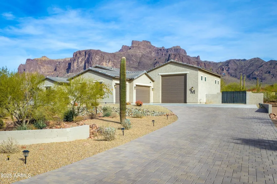 BACK ON MARKET. Located in the picturesque Arroyo Vista Estates, with breathtaking views of the Superstition Mountains. Meticulously landscaped with an elegant paver driveway and landscape lighting. The 3-car garage plus an expansive 45x23 RV garage, and includes a separate workshop, plus 2 RV gates. A thoughtfully designed interior layout with 3 generous bedrooms and a flexible room that can serve as a home office, guest room, or exercise space. Great Room is open to the gourmet kitchen featuring 42-inch espresso-finished cabinets, granite countertops, recessed lighting, top-of-the-line appliances and ample counter space. This is a rare opportunity on a move-in ready home on the best lot in the community.
