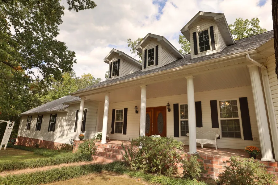 Welcome to your private Ozark Paradise. Just 30 mins from Springfield, down a quiet country lane, out of sight of neighbors, this 40-acre estate has over 9000 square feet with 8 bedrooms and 5 bathrooms. Featuring 10-foot ceilings through most of both levels, this home is ready for entertaining family and friends inside and out. The formal living and dining rooms lead to a dream kitchen redone in 2024 with new appliances and beautiful quartzite countertops, breakfast room and sunroom overlook the woods, and a split bedroom plan. Downstairs you will find a huge living area, full kitchen, 3 bedrooms and 2 baths. Back upstairs a surprise awaits off the master suite, with a third huge living space, two more bedrooms or his and hers offices, and stairs to the indoor pool and exercise room. Across the back of the house is an enormous multi-level deck you have to see to believe. A rear driveway makes the downstairs accessible at ground level. The roof is new and the house temperature is controlled by a geo-thermal system. The woods are full of redbud and dogwood blossoms in the spring, brilliant colors in the fall, and animal wildlife all year-round. Whether you enjoy entertaining, quiet evenings on the deck, or walking in the woods, hurry to grab this rare private sanctuary. Check out the video:
