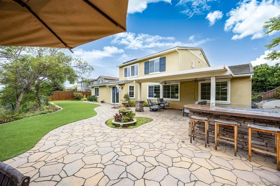 This stunning Sky Ranch dream home is part of the prestigious Eagle Pointe development. It has everything you could ask for in a luxury home: paid-in-full solar, a low-maintenance turf yard with a BBQ island, a three-car garage with an EV charger, a water filtration system, a chef's kitchen featuring high-end appliances with double ovens, and a custom-built-in fridge. The floor plan features a formal dining room with a butler's pantry, a play area/office adjacent to the family room, two bedrooms with en-suite bathrooms downstairs, two fireplaces, and a spacious primary suite with a walk-in closet, double sinks, and a separate tub and shower. The tranquil backyard offers privacy and views of the mountains and El Cajon Valley!